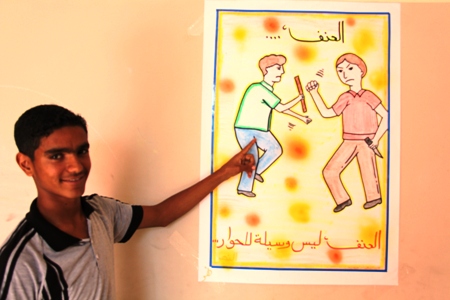“العنف ليس وسيلة للحوار” عبارةٌ كتبها طالب بالسادس عشر من عمره من مدرسة عبد الفتاح حمودة على الصورة التي رسمها بعد تنفيذ جلسات توعية حول بدائل العنف وحل النزاعات ضمن فعاليات مشروع السلم الأهلي.