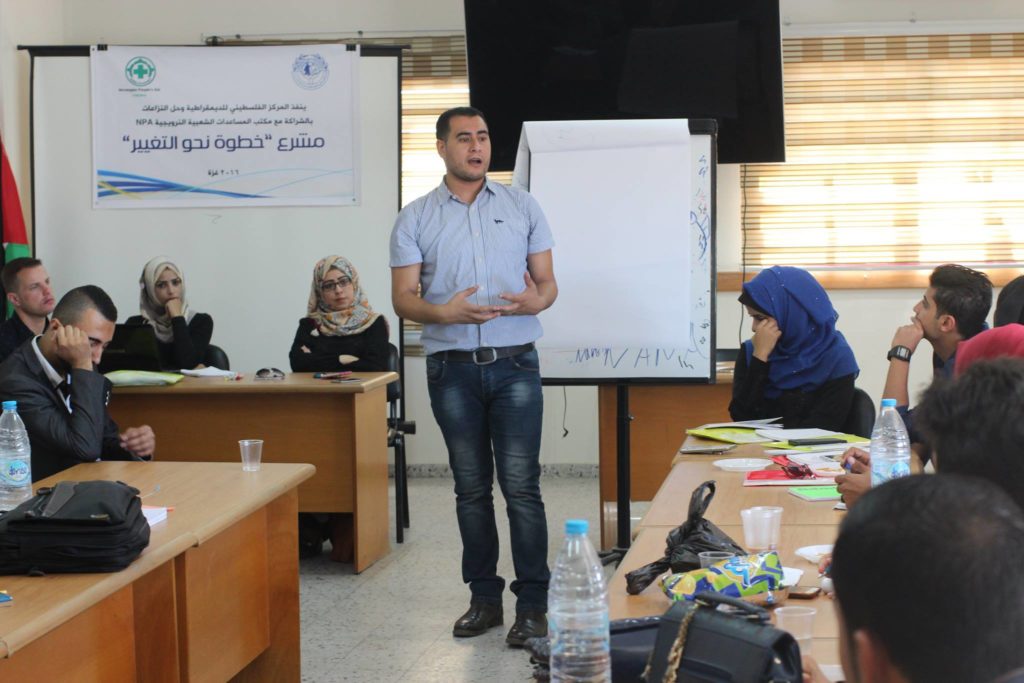 انتهى المركز الفلسطيني للديمقراطية وحل النزاعات من تنفيذ البرنامج التدريبي الأول حول “تطوير مهارات الشباب في المساءلة المجتمعية وحملات الضغط والمناصرة“ ل 25 شاب وشابة ضمن مشروع خطوة نحو التغيير الذي ينفذه المركز بالشراكة مع مكتب المساعدات الشعبية النرويجيةNPA . حيث يعد هذا البرنامج هو المرحلة الأولى من المشروع، والتي تهدف إلي تشكيل ائتلاف شبابي على المستوى الوطني ناشط في العمل المجتمعي والسياسي للمطالبة بحقوقهم في حرية التعبير وتكوين الجمعيات، ويشمل هذا البرنامج عدة مدن فلسطينية منها مدينة غزة ونابلس والخليل. ومن أهم الموضوعات التي تضمنها البرنامج التدريبي: المساءلة المجتمعية، والديمقراطية والمواطنة، والمشاركة المجتمعية، وقانون تشكيل الجمعيات، والضغط والمناصرة بمشاركة مجموعة من المدربين في كافة المناطق التي شملها التدريب.