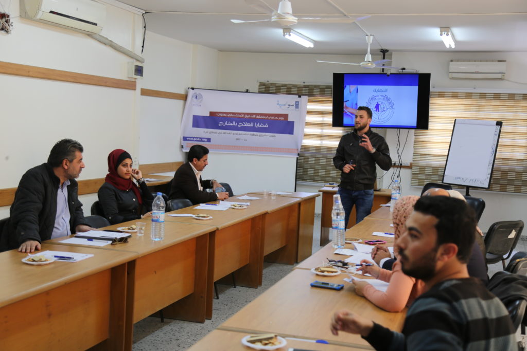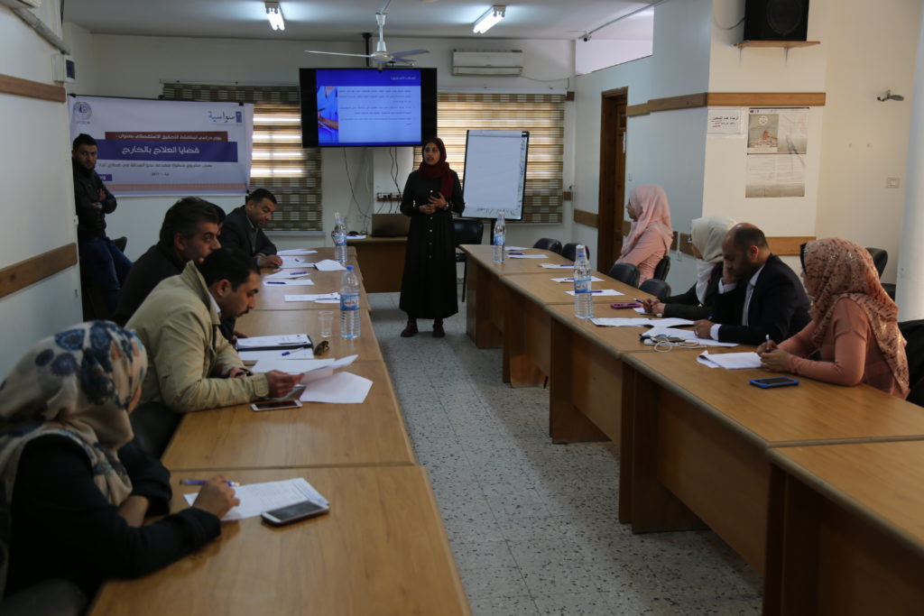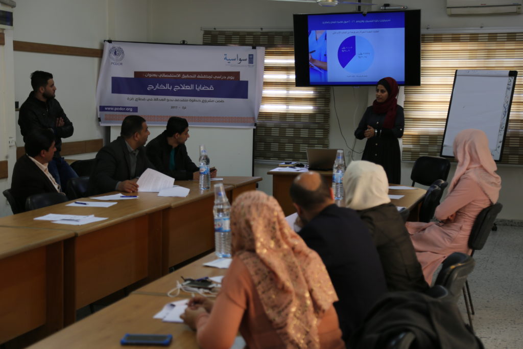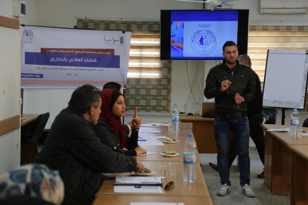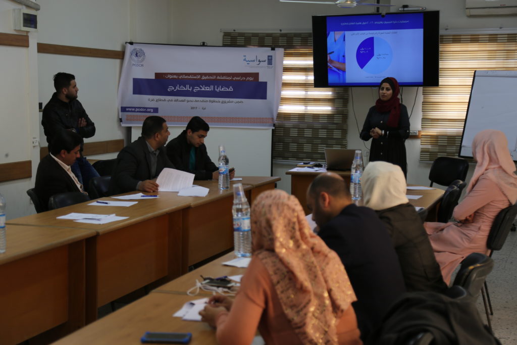 مشروع خطوة متقدمه نحو العداله فى قطاع غزة (سواسيه ) لمناقشة التحقيق الاستقصائي بعنوان: قضيا العلاج بالخارج، الذي أعده فريق البحث في المركز الفلسطيني للديمقراطية وحل النزاعات؛ وحضر اليوم الدراسي أطباء وحقوقيون وممثلو مؤسسات حقوقية ونشطاء شباب.