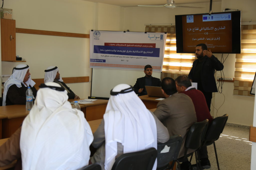 نفذ المركز الفلسطيني للديمقراطية وحل النزاعات يوم الخميس الموافق 9-12-2017 يوماً دراسي لمناقشة التحقيق الاستقصائي بعنوان : المشاريع الاسكانية (طرق توزيعها و المنتفعين منها) ضمن مشروع خطوة متقدمه نحو العداله فى قطاع غزة (سواسيه )، الذي أعده فريق البحث في المركز الفلسطيني للديمقراطية وحل النزاعات؛ ضمن أنشطة مشروع خطوة متقدمة نحو العدالة في قطاع غزة.. بدأ اليوم الدراسي بالترحيب بالضيوف الحاضرين وتقديم نبذة عن التحقيق وأبرز ما جاء فيه؛ ومن ثم فتح باب النقاش والتعليق والاستفسار حول التحقيق وما جاء فيه بحضور فريق البحث الذي أعد التحقيق للإجابة والإفادة. علماً بأن التحقيق سينشر قريباً بعد الانتهاء من تضمين محضر اليوم الدراسي، على صفحة المركز على الفيس بوك وعلى المواقع الالكترونية للمركز.
