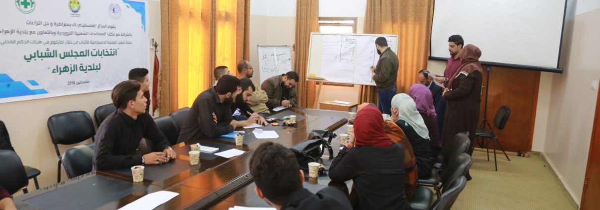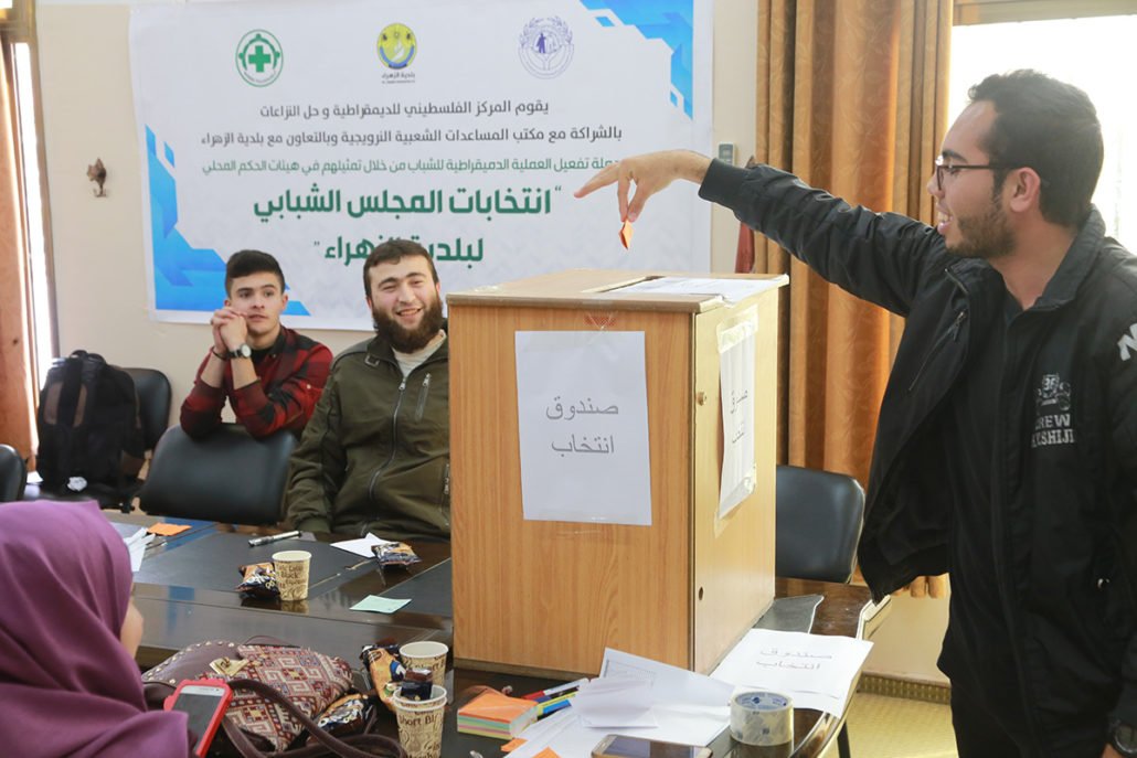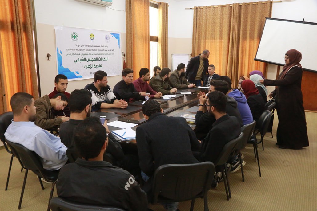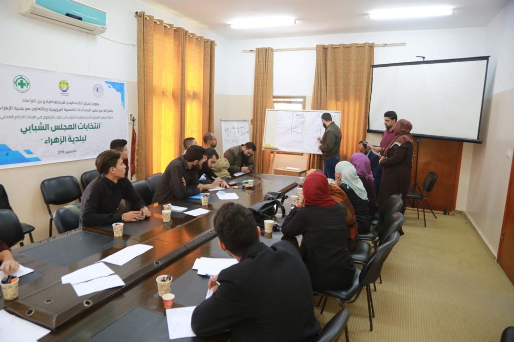 نظم المركز الفلسطيني لديمقراطية وحل النزعات بالشراكة مع بلدية الزهراء تظاهر ديمقراطي الأول في مدينة الزهراء من خلال تشكيل وانتخاب مجلس شبابي لزهراء حيث اثر التعاون المشترك بين المركز والبلدية ومن خلال جهد استمر لعدة شهور من انتخاب مجلس شباب بلدية الزهراء والتي تكون من 7 أعضاء وقد دلت التجربة علي وعي الشباب الفلسطيني اتجاه العملية الديمقراطية حيث تنافس الشباب والشابات مع مقاعد المجلس المسبقة وفازت الشابات باعلي الأصوات ويعتبر المجلس الشبابي هو التجربة الديمقراطية الاولي علي مستوي البلديات في قطاع غزة والذي جاء نتيجة للعديد من الأنشطة المشتركة والتي تاتي ضمن مشروع خطوة نجو التغير بالشراكة مع مكتب المساعدات الشعبية النرويجية وعن تجربة العمل المشترك والوصول للانتخابات وتشكيل المجلس ذكرت سمر حمد استشارية حملات الضغط والمناصرة في المركز ان هذا المجلس ثمرة التعاون مع بلدية الزهراء والتي أبدت مرونة وتعاون كبير من خلال اعتمادها الرسمي لتشكيل المجلس واجراء لانتخابات وتنظيم عمل المجلس بالتعاون مع البلدية