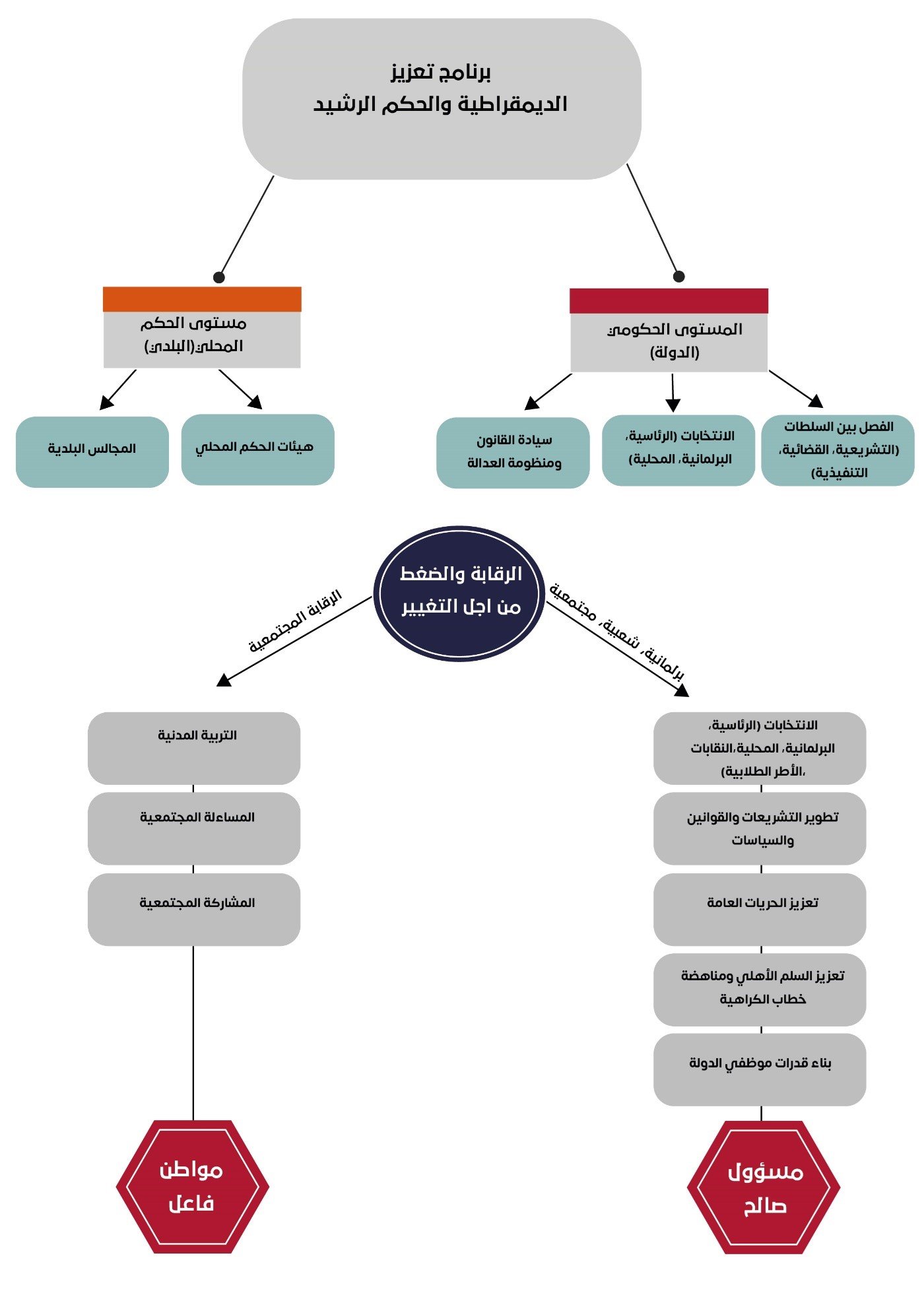 وذلك من خلال تبني مشروعات تهدف إلى التربية المدنية وتعزيز تطبيقات المساءلة الاجتماعية وتعزيز مشاركة المواطنين في صناعة القرار على المستوى البلدي وبناء علاقة إيجابية فعالة بين الهيئات البلدية والمواطنين بهدف تحسين الخدمات المقدمة للمواطنين في حياتهم اليومية.